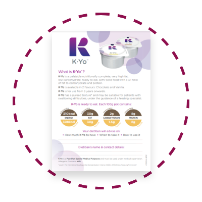 A unique, ready to eat, palatable semi-solid food for use in the ketogenic diet. Suitable from 3 years of age onwards. Suitable as a sole source of nutrition up to 10 years of age. K.Yo is a food for special medical purposes and must be used under medical supervision.